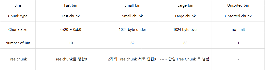(*unsorted bin은 small bin과 large bin 크기의 힙 chunk가 해제되면 이후 재할당을 위해 사용되는 bin.)