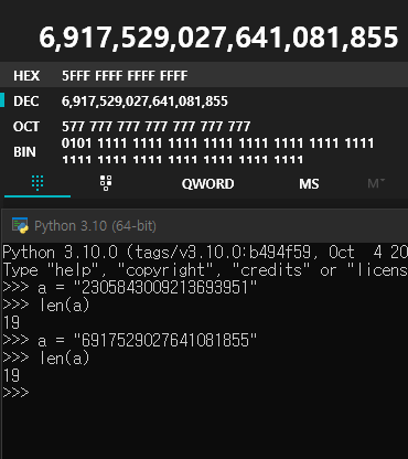 그럼 우리가 입력할 수 있는 길이는 24이니까, 주소로 8바이트를 정수 값으로 전달 할 수 있을지 확인 해보았다. 확인해보니, 길이가 19이므로 충분히 전달 가능하다.