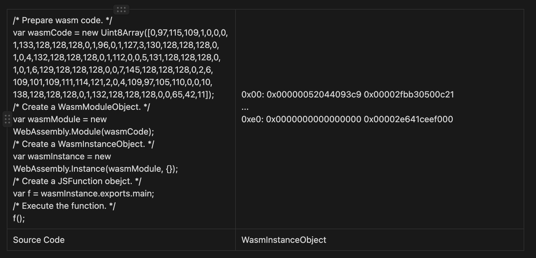 이 또한 RWX 페이지 주소를 구하는 방법을 설명한다. 이는 아래 표에서 알 수 있듯이, 먼저 wasm code를 Array에 넣고 WasmModuleObject를 생성한다. 그 다음 이를 사용해 WasmInstanceObject 를 생성하고 이를 통해 함수의 entry 포인트를 알아내 변수 f에 넣고 이를 실행한다.