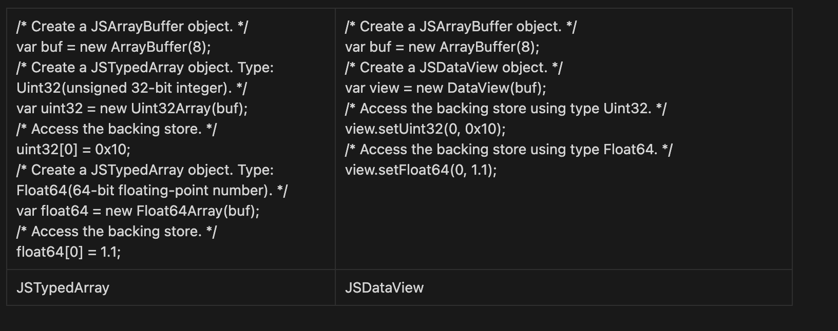 JavaScript Code 로 ‘var buf = new ArrayBuffer(8);’ 로 JSArrayBuffer object 를 생성할 수 있다.