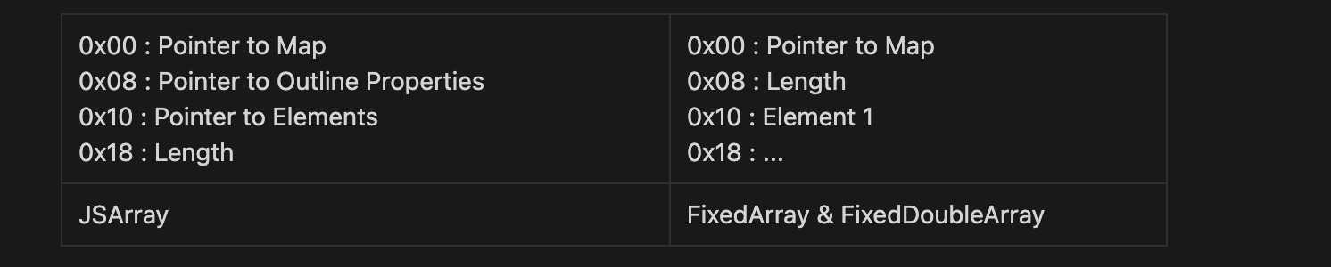 - FixedArray와 FixedDoubleArray는 둘 다 배열의 Body 역활을 한다. ( 배열의 요소를 저장)