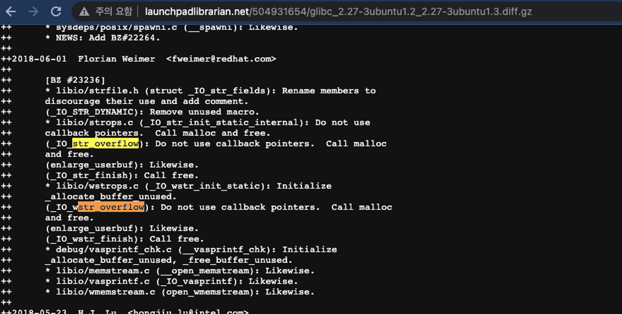 *(glibc 2.27 3ubuntu 1.3 버전 diff —> str_overflow 에서 callback 포인터를 사용하지 않음 —> 더이상 이 방법은 사용하지 못함.)