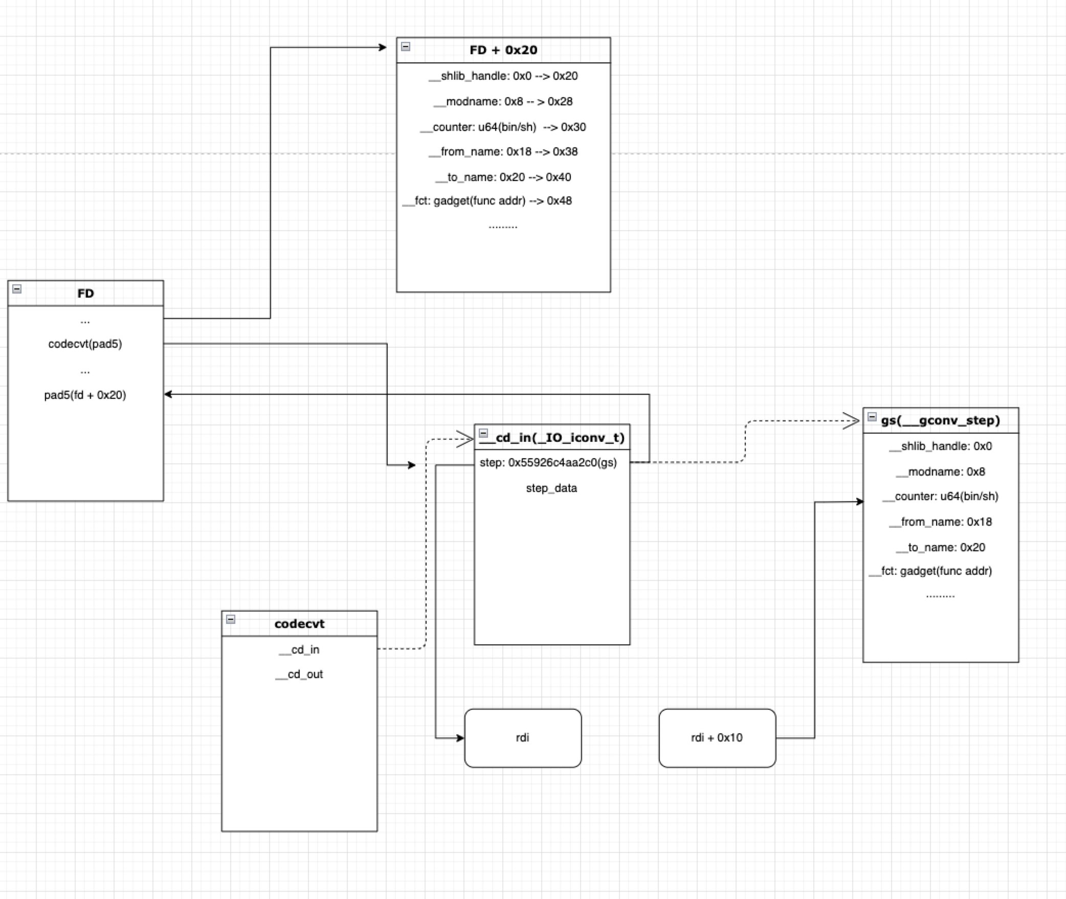 최종적으로 _code_cvt 를 사용하여 DL_CALL_FCT 의 인자를 조정하여 익스하는 법이다. --> 이 방법은 잘만 사용하면 하나의 공간(파일 구조체 공간) 만으로 익스가 가능하다.