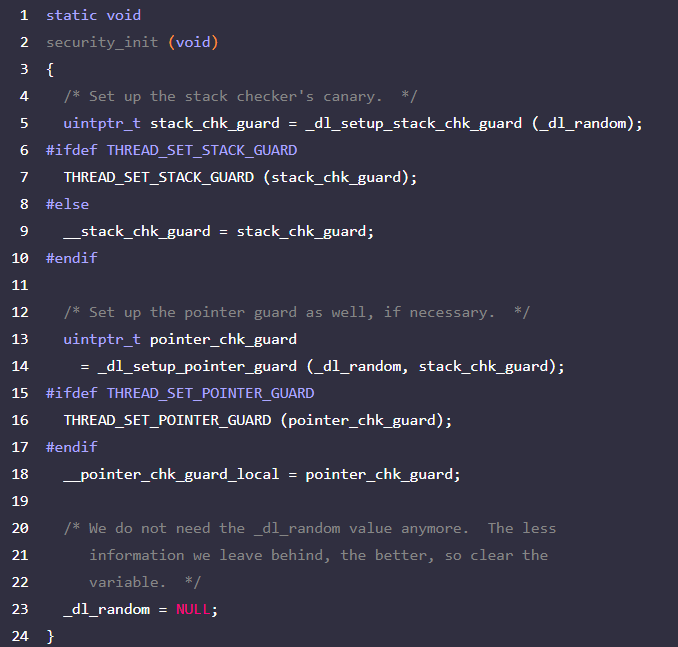 THREAD_SET_STACK_GUARD(MACRO): 카나리 생성 후 해당 값을 이 매크로의 인자로 전달한다. 이 매크로는 THREAD_SETMEM 매크로를 통해 두 번째 인자인 header.stack_guard 위치에 value(Canary)를 삽입한다.