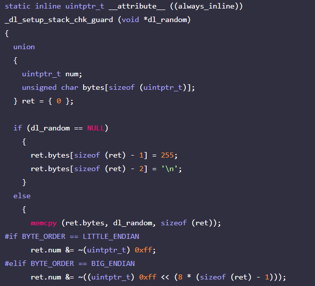 보면 dl_random이 NULL이 아닐 경우, 공용체 변수 ret에 dl_random을 복사한다. 이후 바이너리의 바이트 오더링에 따라 AND연산을 수행하는데, 리틀엔디언의 경우 복사한 값의 첫바이트를 NULL로 변환한다. -> NOT(FF) AND 7777 -> 7700